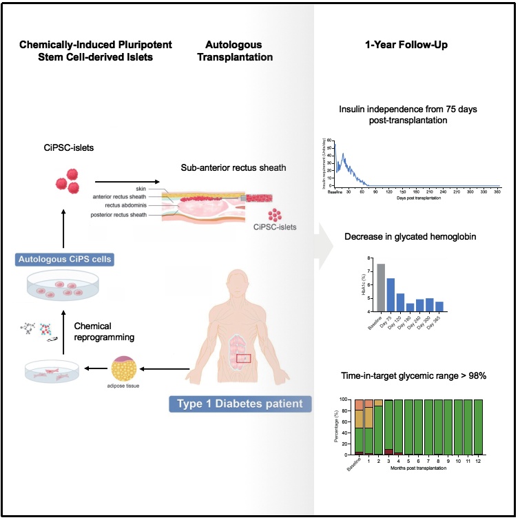 这一成果由天津市第一中心医院的沈中阳、王树森研究组,携手北京大学、昌平实验室的邓宏魁研究组,以及杭州瑞普晨创科技有限公司共同打造。他们通过创新的化学重编程技术诱导多能干细胞制备胰岛细胞,并成功地将这些细胞移植给了一名1型糖尿病的患者。该研究成果在9月25日晚在国际权威期刊《细胞》上发表。