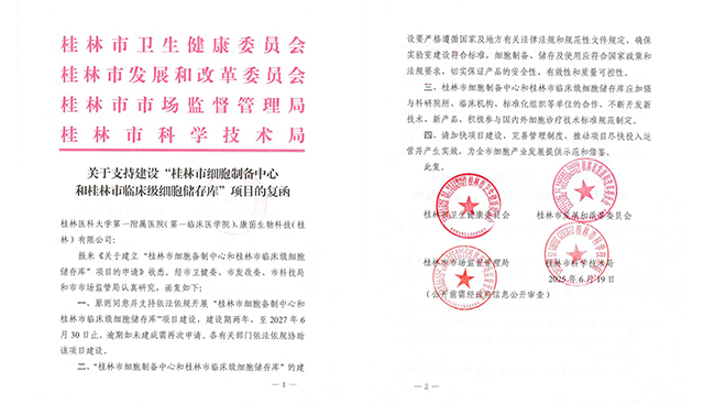 2025年6月19日,桂林市卫生健康委员会、桂林市发展和改革委员会、桂林市市场监督管理局、桂林市科学技术局四部门联合下发了《关于支持建设“桂林市细胞制备中心和桂林市临床级细胞储存库”项目的复函》,正式批复支持桂林医科大学第一附属医院(第一临床医学院)、康茵生物科技(桂林)有限公司开展相关工作。