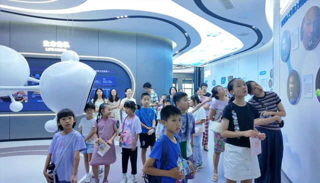 随后步入生命科学馆展厅,一场妙趣横生的细胞探索之旅就此展开。在科普讲解员的带领下,孩子们在图文并茂的展板和互动展项前驻足,认真聆听关于细胞的结构、功能及其在再生医学中的重要作用。科普讲解员以“细胞是生命的建筑师”为切入点,通过互动问答引导孩子思考:“为什么我们的伤口能愈合?”“细胞如何保护我们人体?”,从原本抽象的“干细胞”知识,通过通俗易懂的语言和有趣的互动瞬间变得生动鲜活,孩子们兴趣盎然,家长们也收获满满。