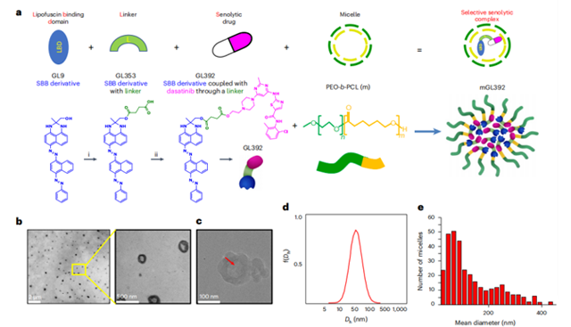 近期,抗衰老领域传来一则令人振奋的消息。雅典国立卡波季斯特里安大学的教授团队在权威期刊《Nature Aging》上发表了一篇题为“Generation of a selective senolytic platform using a micelle-encapsulated Sudan Black B conjugated analog”的文章,为我们带来了一种新型的纳米载体——mGL392,它就像一位智能的“细胞清洁工”,专门用于精准清除衰老细胞。将GL392(一种携带达沙替尼的衰老化合物)封装在胶束纳米载体(称为mGL392)中,可以在体内外通过靶向释放衰老剂选择性地消除衰老细胞,且具有最小的全身毒性。这个纳米载体就像是一个智能的“细胞清洁工”,能够精准地找到并清除衰老细胞,增强衰老治疗药物对衰老细胞的靶向性,而对正常细胞几乎没有影响。