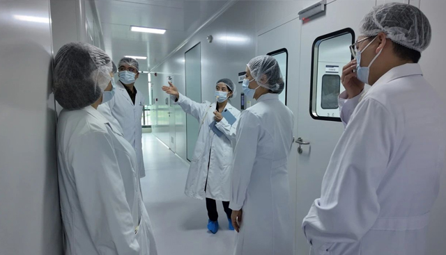 随后,一行人前往二楼广西综合细胞库、细胞制备实验室和细胞药物研发实验室。这里,科研人员专注实验的身影、先进的仪器设备,都彰显着细胞技术研发的严谨与创新。领导们不时驻足询问,详细了解实验流程与科研成果。